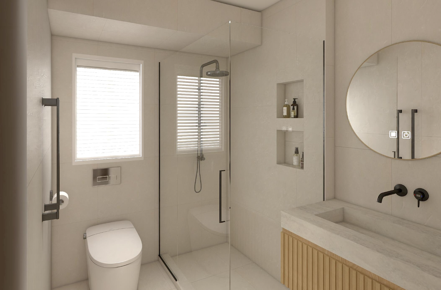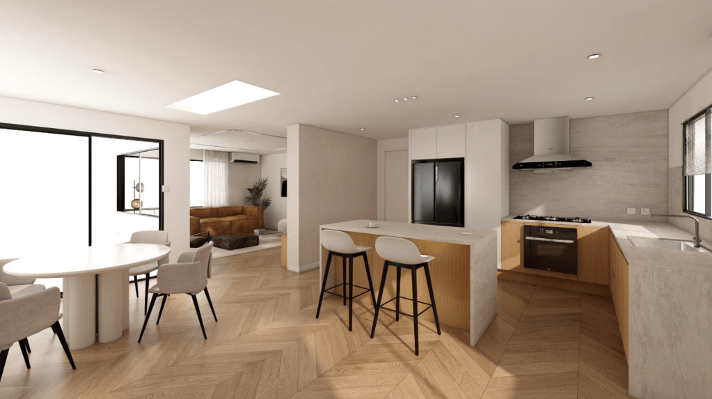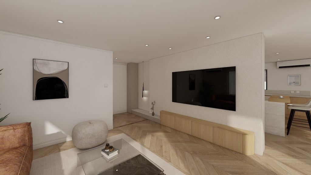 This renovation involved comprehensive spatial replanning with full construction follow-through. The interior adopts a modern aesthetic, layered with warm natural timber tones and peaceful stone elements to create a calm, cohesive environment. Despite the limited footprint, storage was carefully prioritised and seamlessly integrated throughout the design. The living area was extended and reconnected with the entryway to enhance openness, while one access point to the hallway was removed to improve spatial flow and create a more considered, intuitive journey through the home.